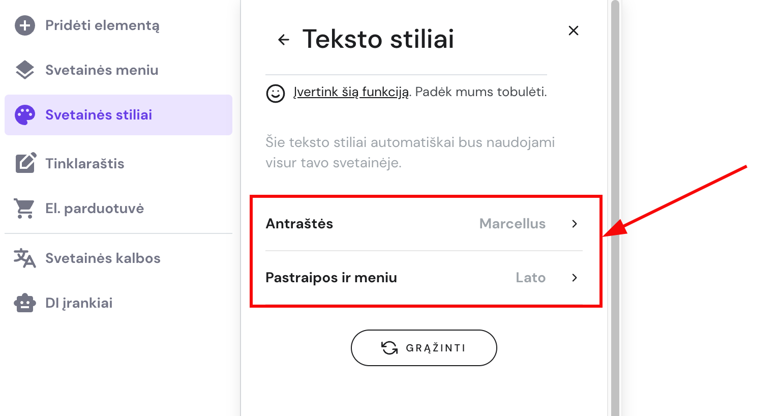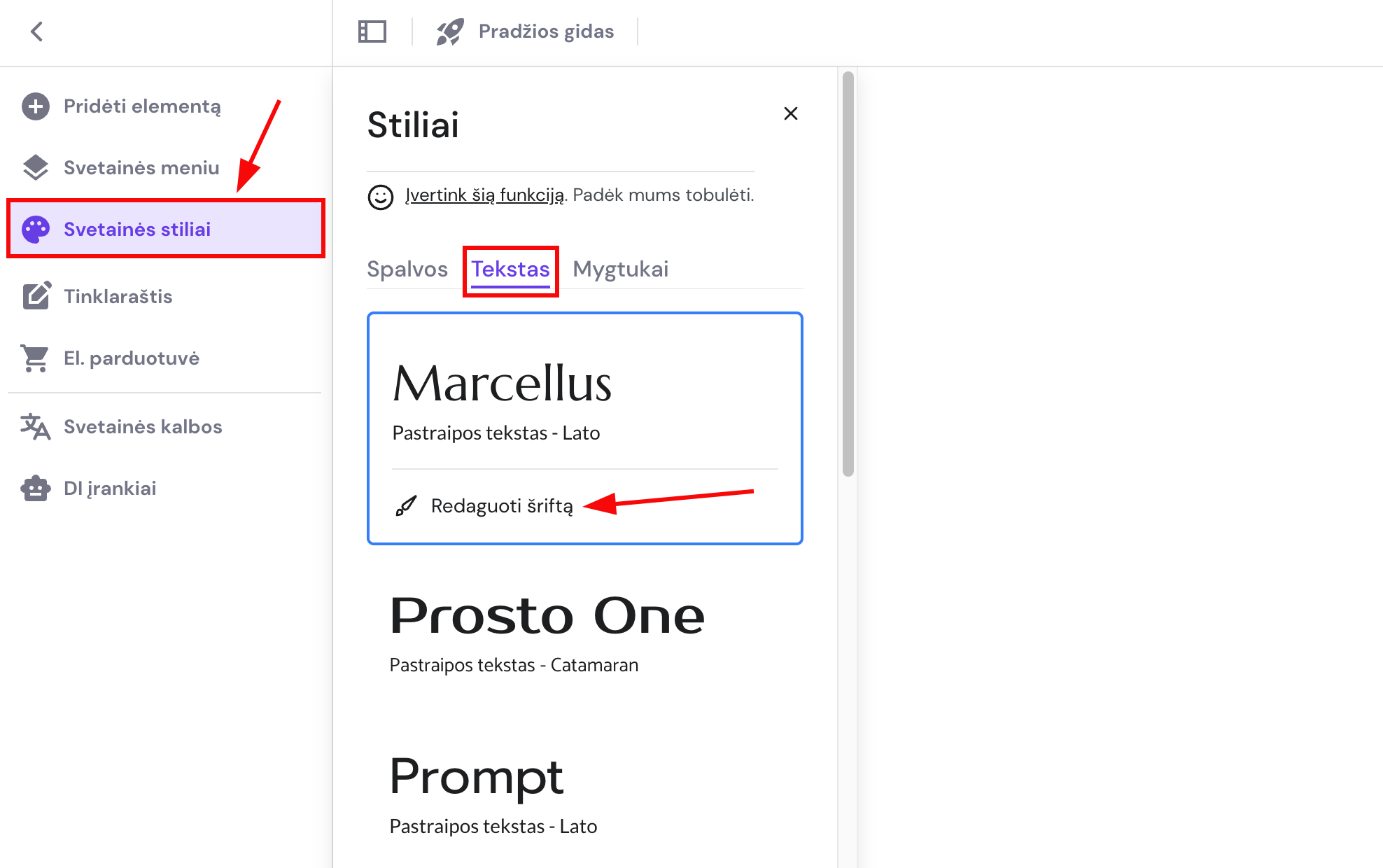 1. Svetainės redagavimo aplinkoje išskleiskite kairėje esančią įrankių skiltį Svetainės stiliai. Atsidarykite skiltį Tekstas ir spauskite Redaguoti šriftą: