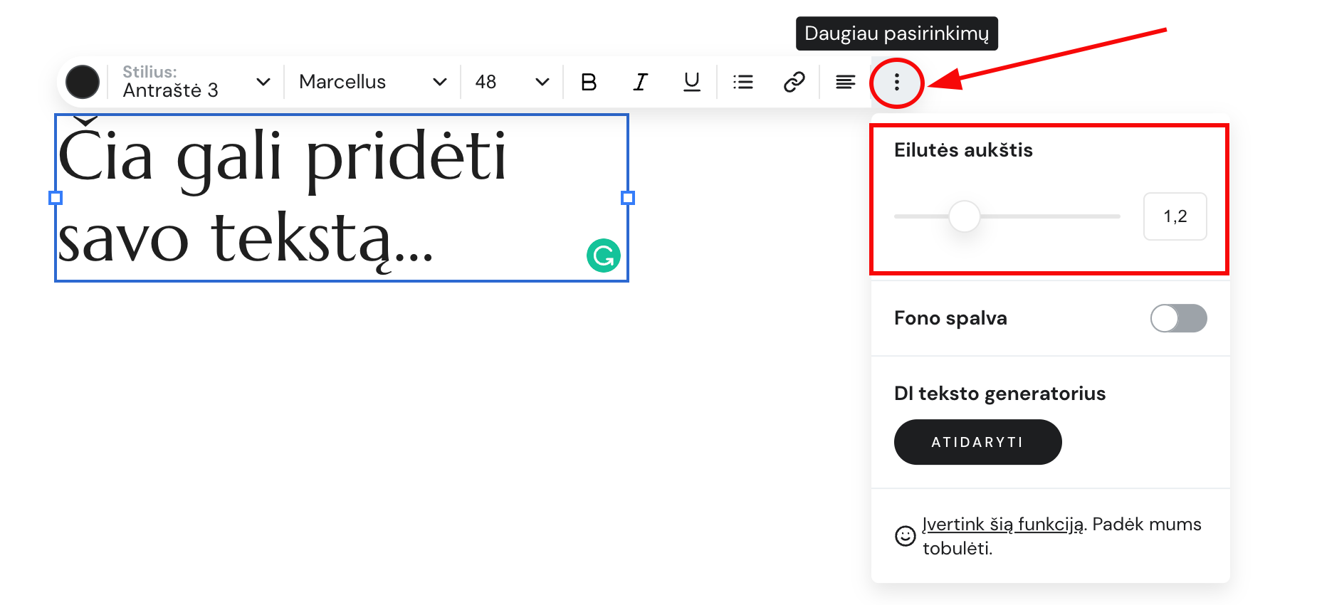 Spauskite ant pasirinkto teksto elemento ir spauskite Redaguoti tekstą. Kad pamatytumėte daugiau parinkčių, spauskite ant įrankių juostoje esančio daugtaškio ⋮ mygtuko ir keiskite eilutės aukštį: