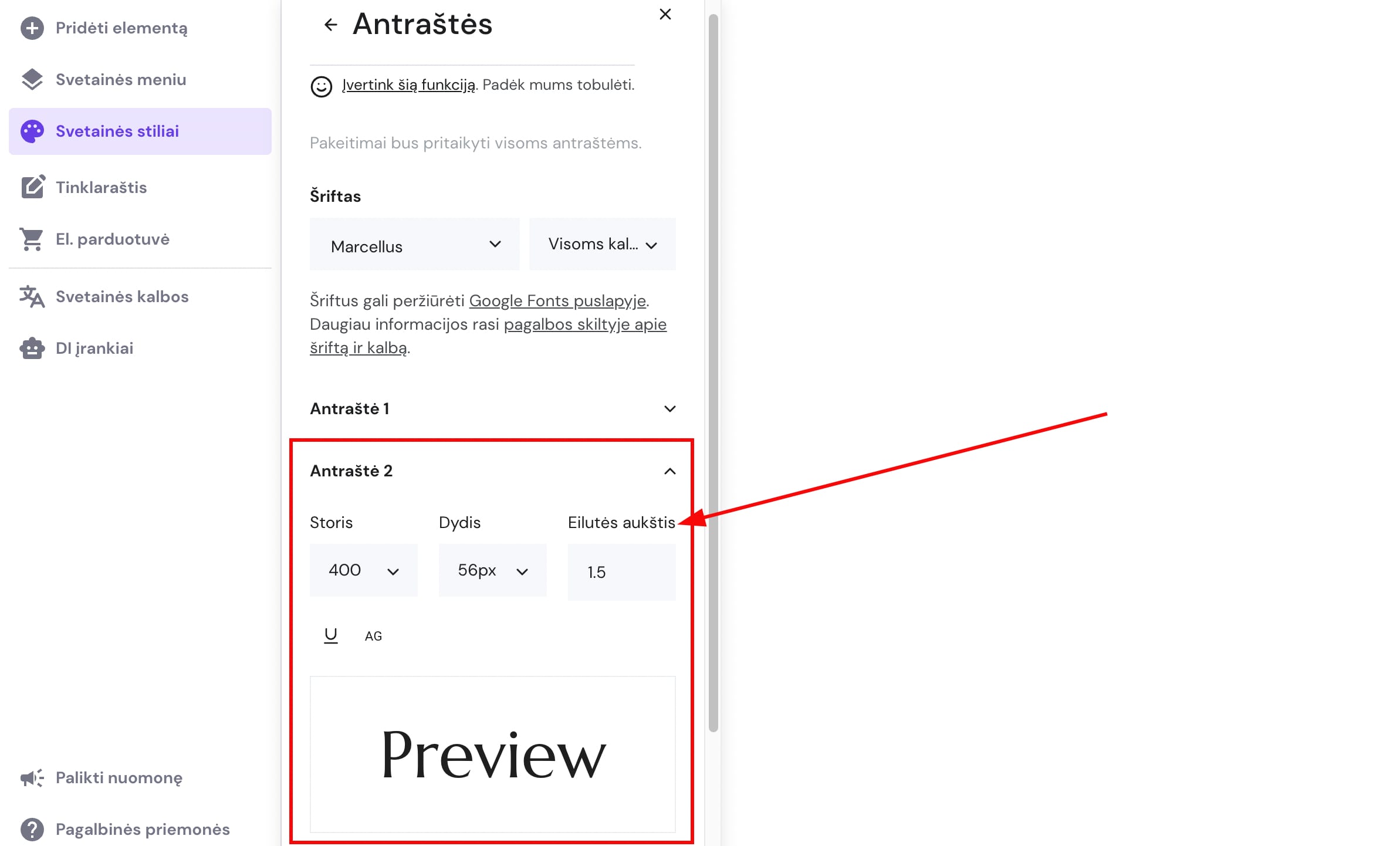 Eilutės aukštis pasikeis visuose konkrečiu stiliumi (pvz., Antraštė 2) užrašytuose teksto elementuose.