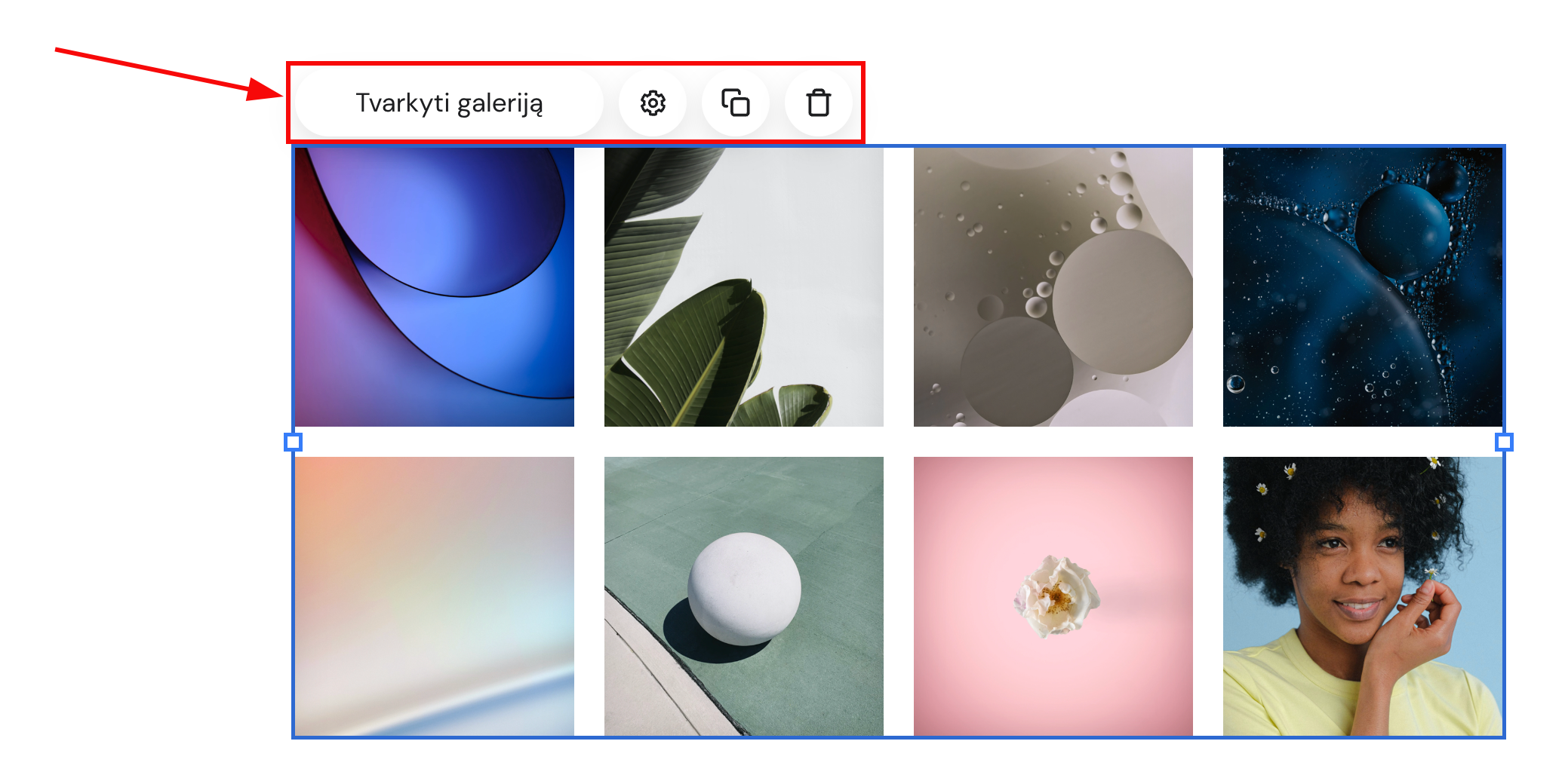 Spauskite ant elemento, kad pamatytumėte daugiau pasirinkimų; galite tvarkyti galeriją, atsidaryti jos nustatymus, dublikuoti ar ištrinti elementą bei keisti jo dydį: