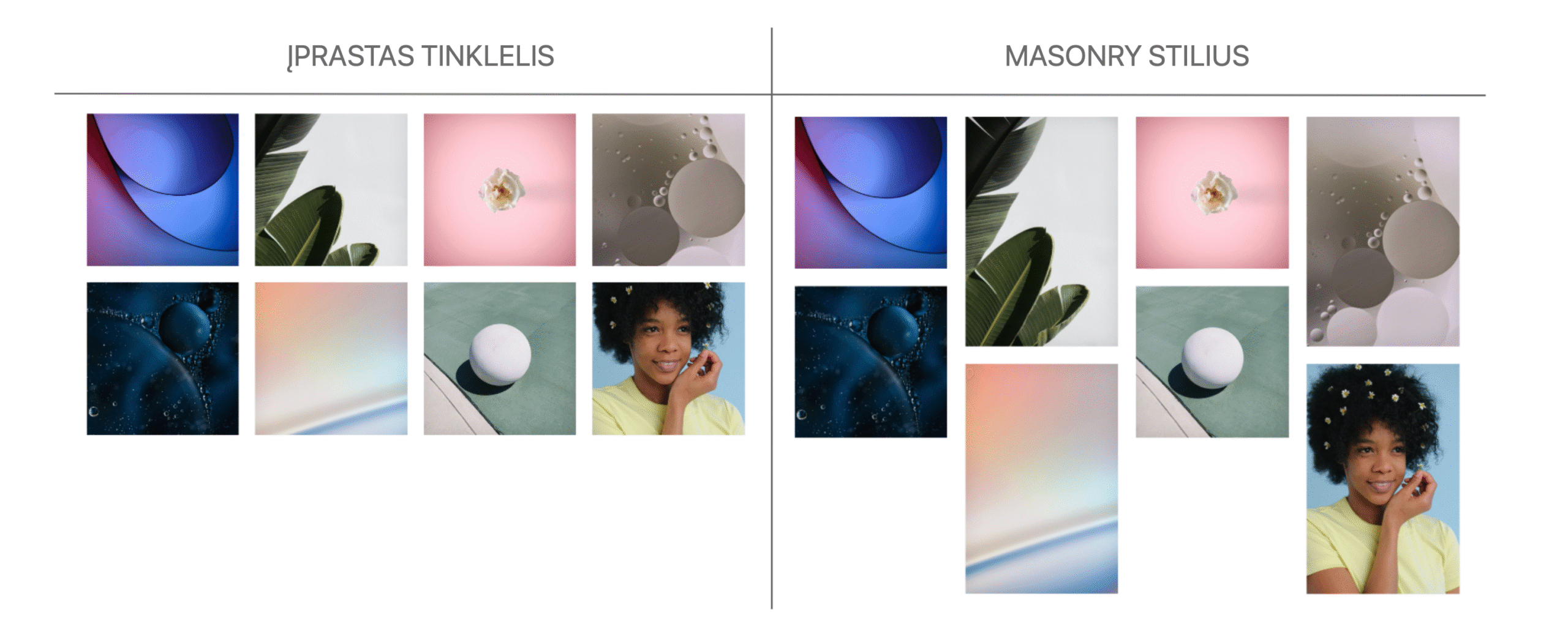 PASTABA: Įprastas tinklelis atvaizduoja nuotraukas kvadrato forma, o masonry stiliumi atvaizduojamos originalių proporcijų nuotraukos:
