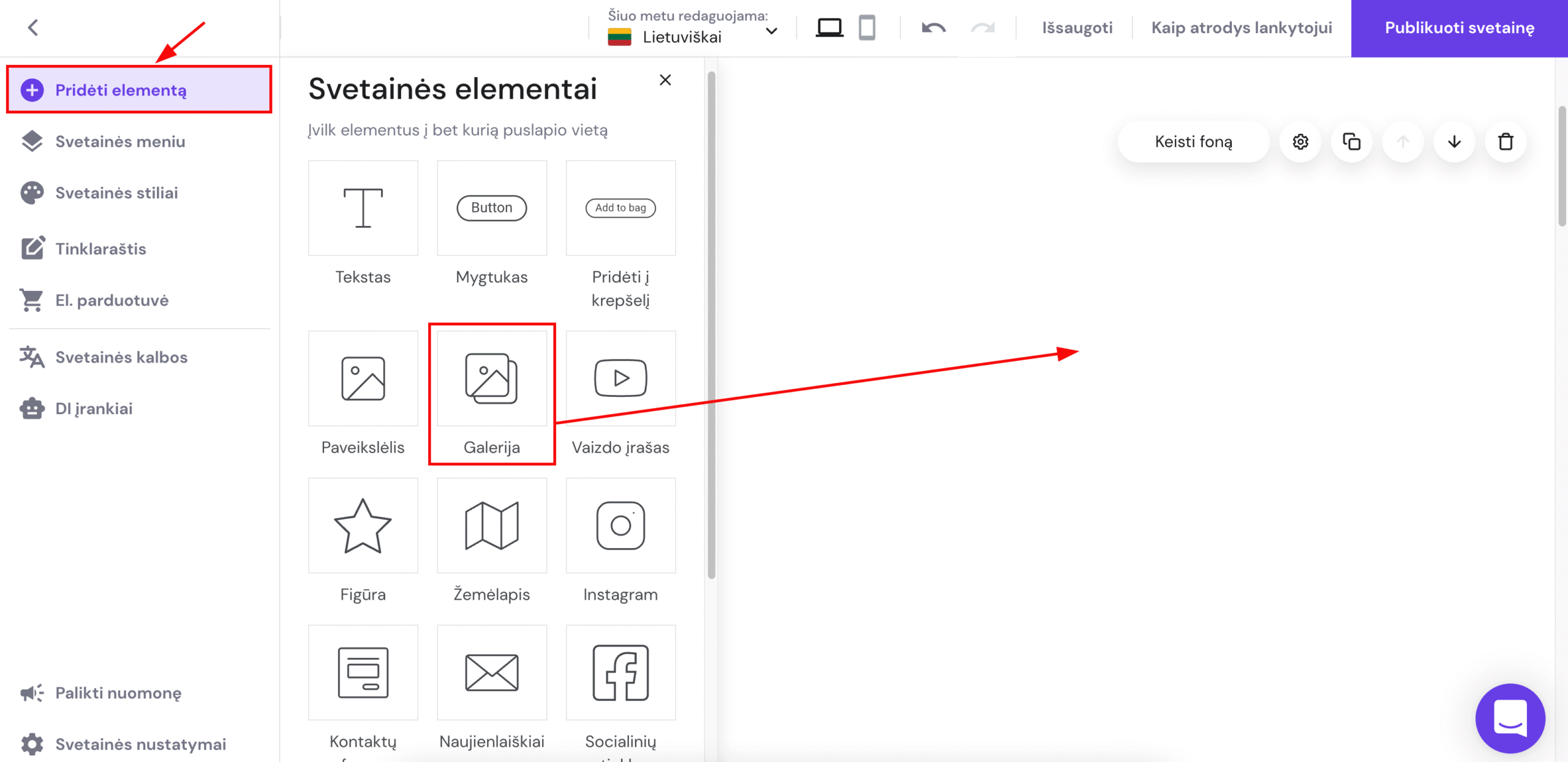 Svetainės redagavimo aplinkoje išskleiskite kairėje esančią skiltį Pridėti elementą. Raskite galerijos elementą ir tempkite jį į norimą puslapio vietą:
