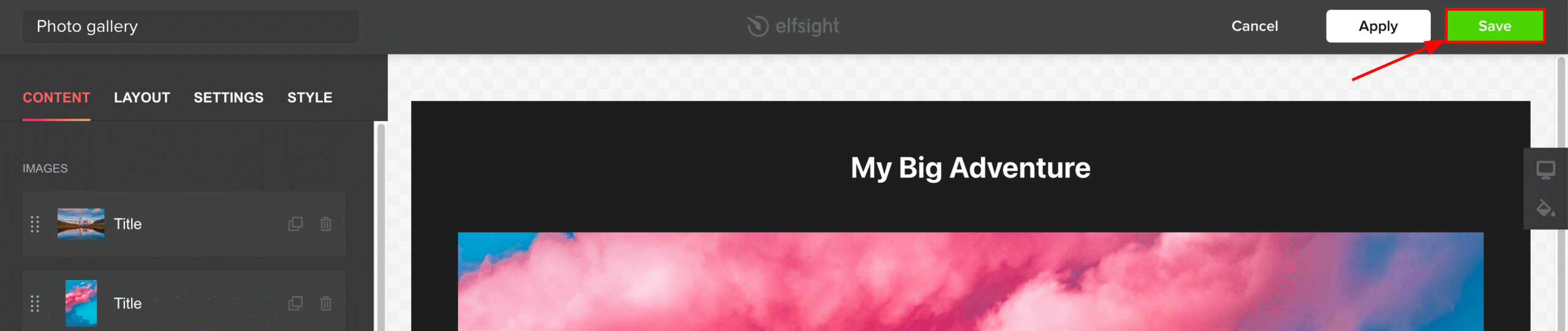 Elfsight siūlo įvarių galerijos šablonų. Pasirinkę patikusį, personalizuokite jį pagal savo poreikius: