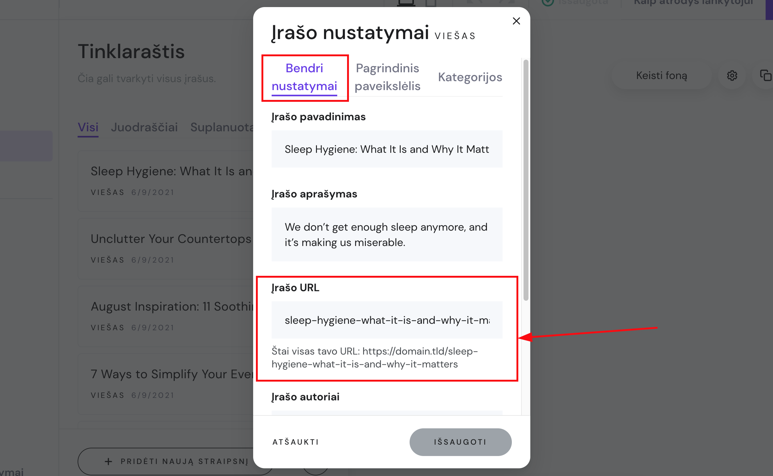 Redaguokite įrašo nuorodą bendruose nustatymuose: