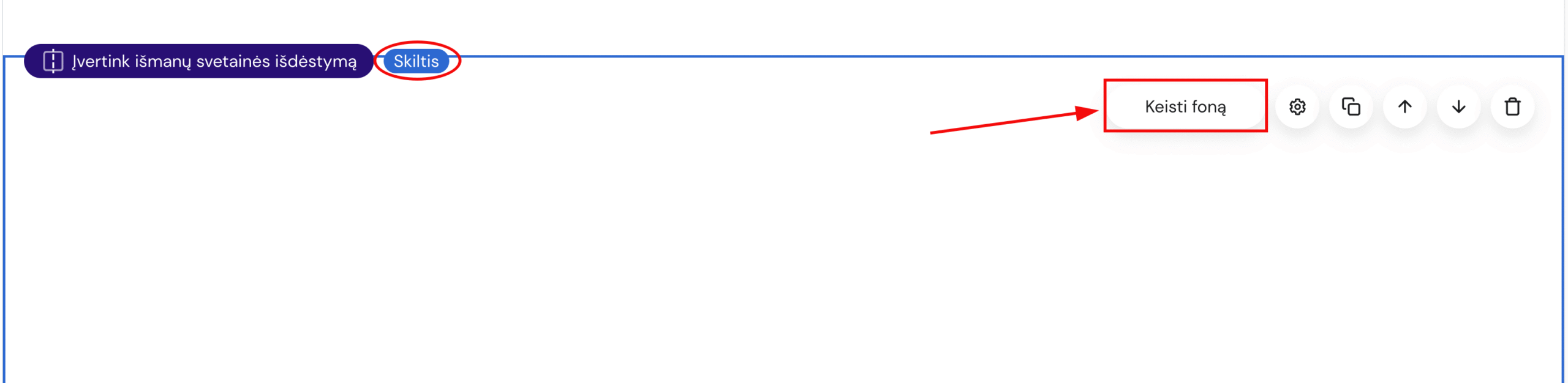 Kad pakeistumėte skilties foną, svetainės redagavimo aplinkoje spauskite ant norimos skilties ir pasirinkite Keisti foną: