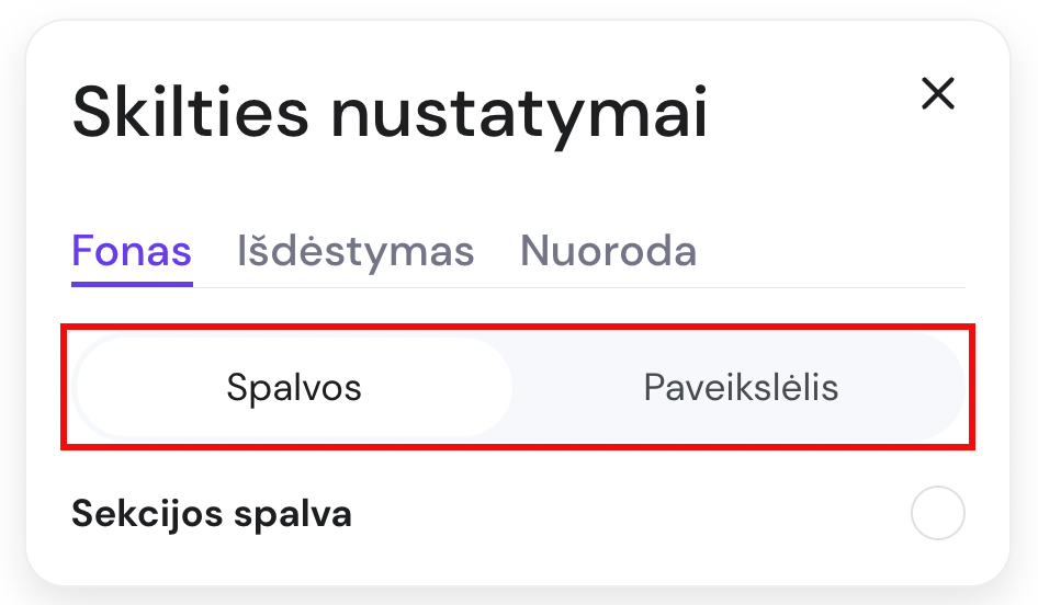 PASTABA: Siekiant optimizuoti puslapio krovimo greitį, rekomenduojama nesirinkti .GIF formato vizualų skilties fonui