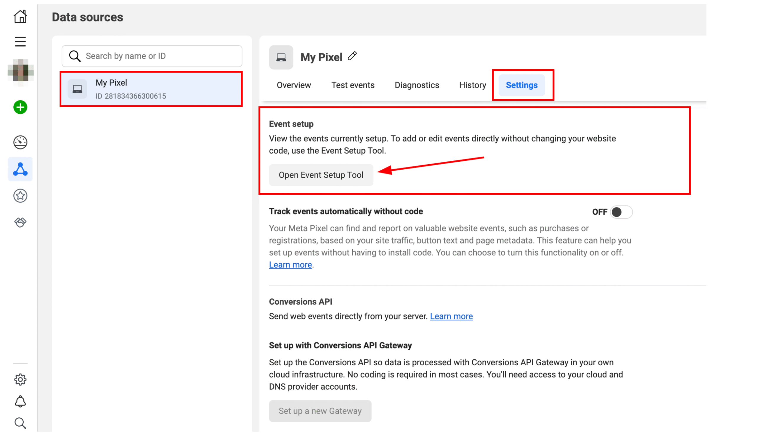2. Pasirinkite norimą pikselį ir atsidarykite jo nustatymus. Raskite pikselio nustatymų skiltį Event Setup ir spauskite Open Event Setup Tool:
