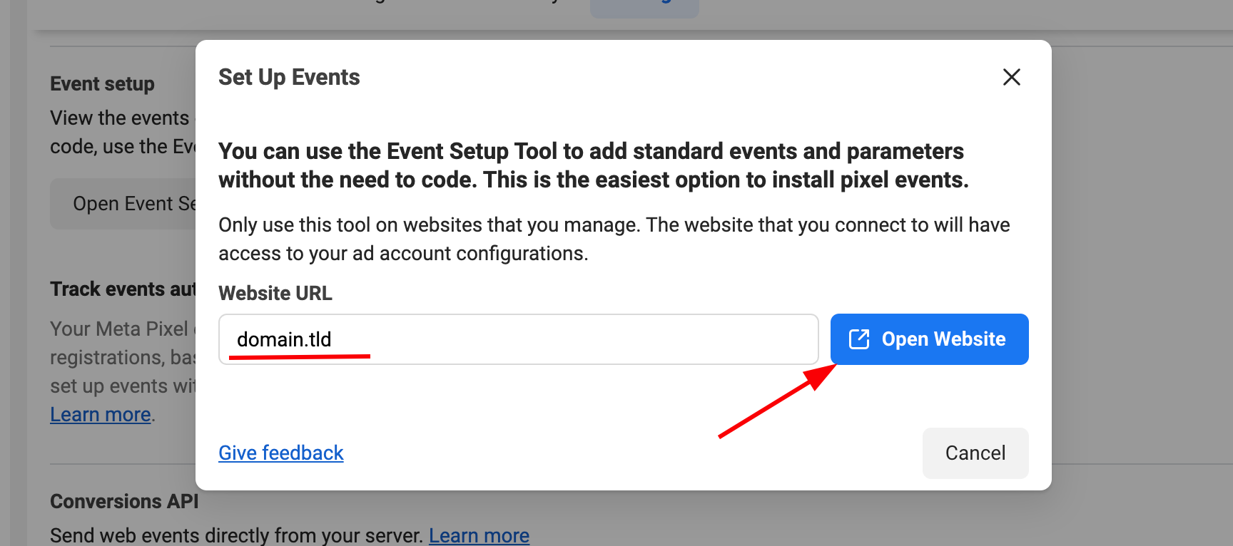 Taip paleisite Event Setup Tool įrankį savo svetainėje. Kuriant pikselio įvykius rekomenduojama laikinai sustabdyti iššokančių langų blokavimo programas.