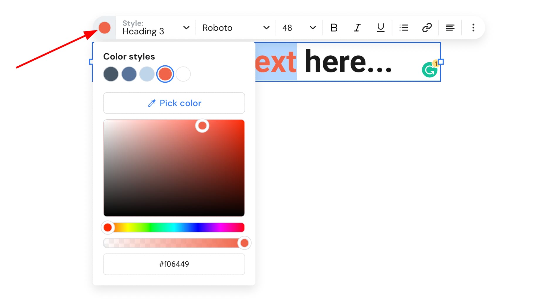 Spauskite ant norimo elemento ar skilties, iš veiksmų meniu pasirinkite Redaguoti ir keiskite spalvą rankiniu būdu. Pavyzdžiui, spauskite ant norimo teksto elemento ir pasirinkite Redaguoti tekstą. Tada, pažymėkite norimą teksto segmentą ir spauskite ant spalvų paletės įrankio: