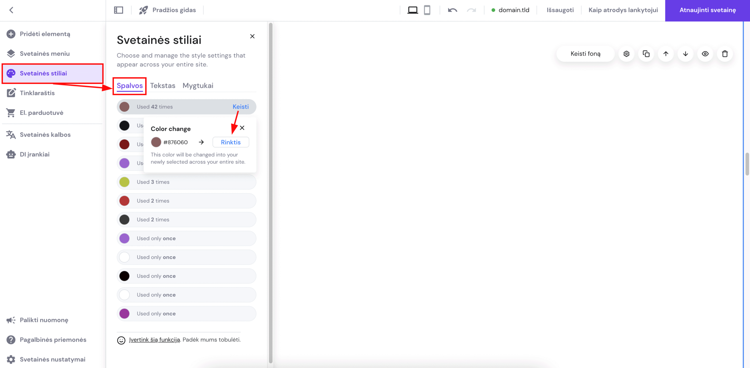 Svetainės redagavimo aplinkoje išskleiskite kairėje esančią įrankių skiltį Stiliai ir atsidarykite poskiltį Spalvos. Čia rasite visas jūsų svetainėje naudojamas spalvas. Dažniausiai naudojamas matysite sąrašo viršuje. Šalia norimos spalvos spauskite Keisti, pasirinkite naują ir ji pakeis ankstesniąją visose svetainės vietose: