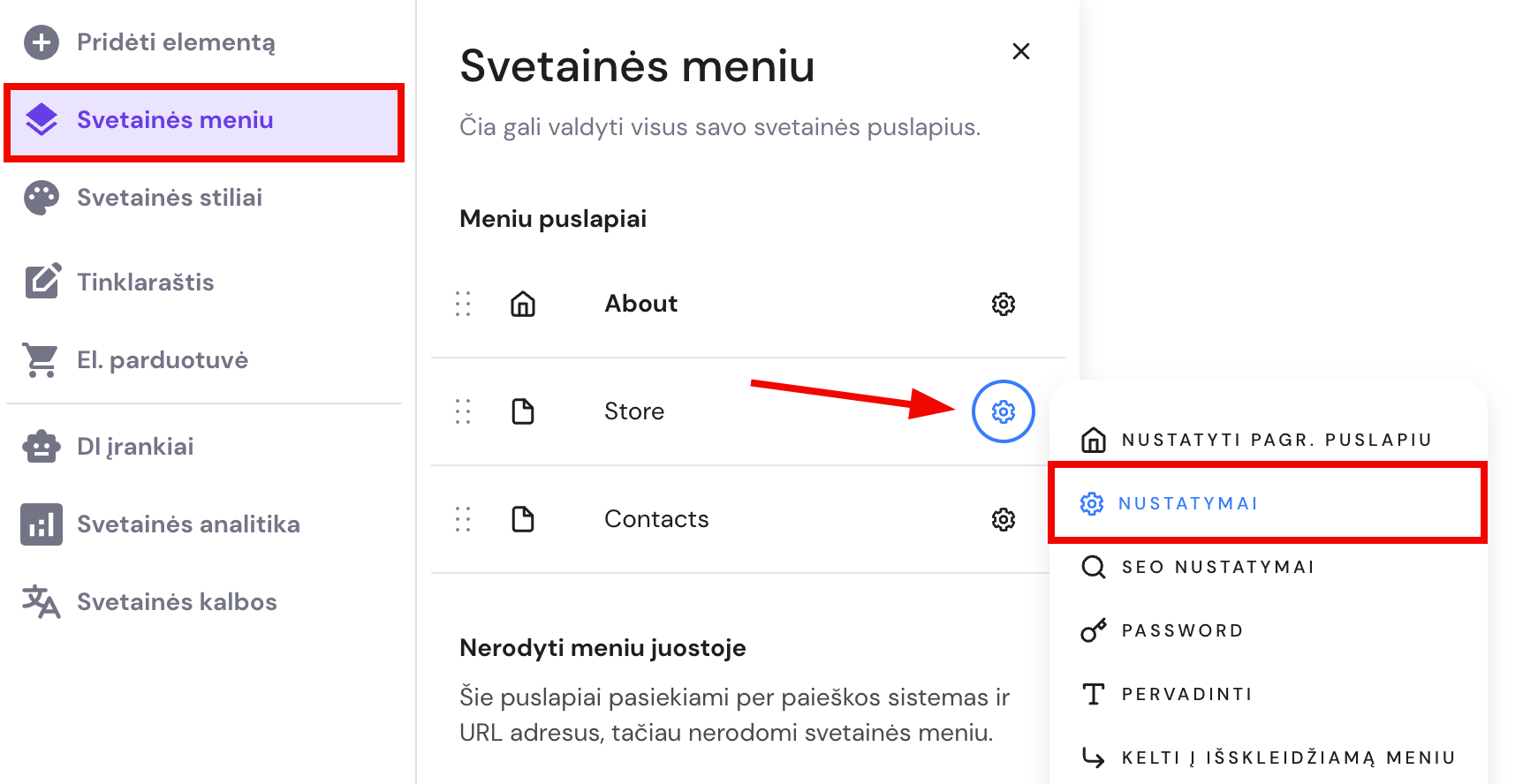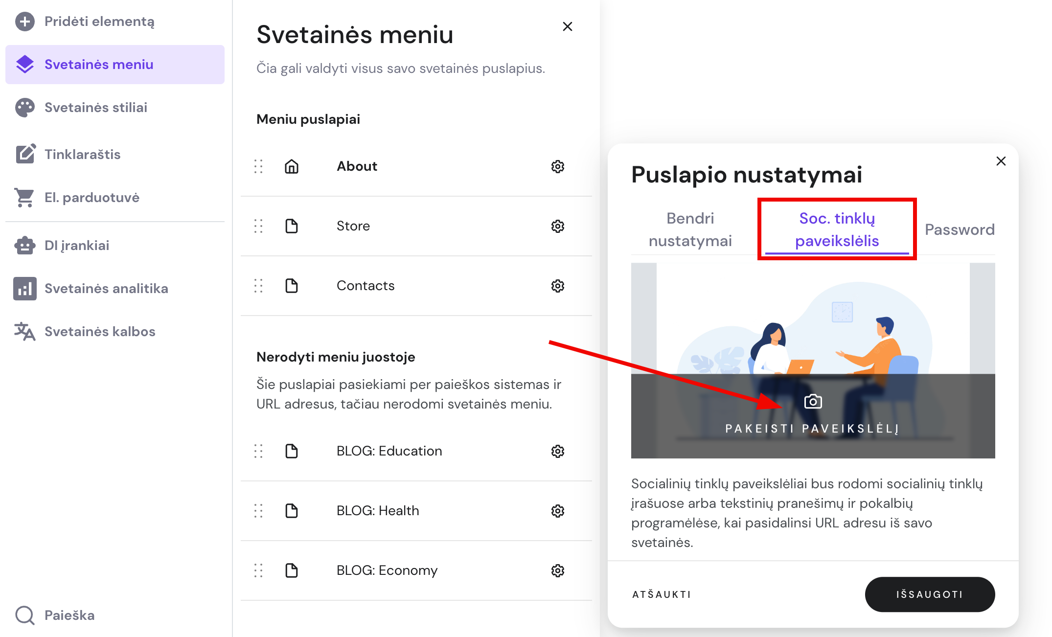 Puslapio nustatymuose pridėsite konkretų puslapį iliustruojantį vizualą. Išskleiskite kairėje esančią skiltį Svetainės meniu ir atsidarykite norimo puslapio nustatymus: