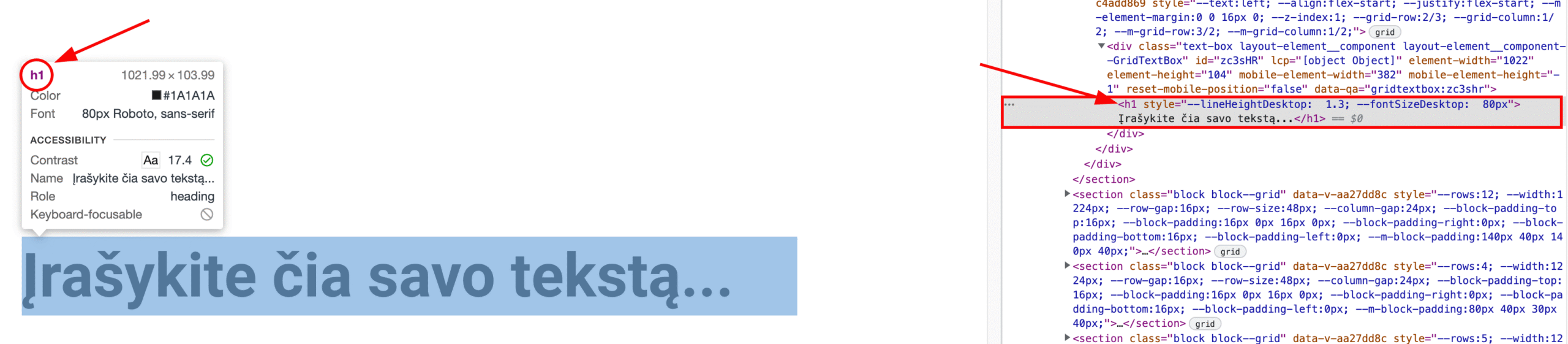 Užrašius tekstą Antraštė 1 stiliumi, svetainės kode tekstui bus automatiškai priskirta <h1> žyma, kurią matys ir į kurią atkreips dėmesį ir paieškos variklių robotai: