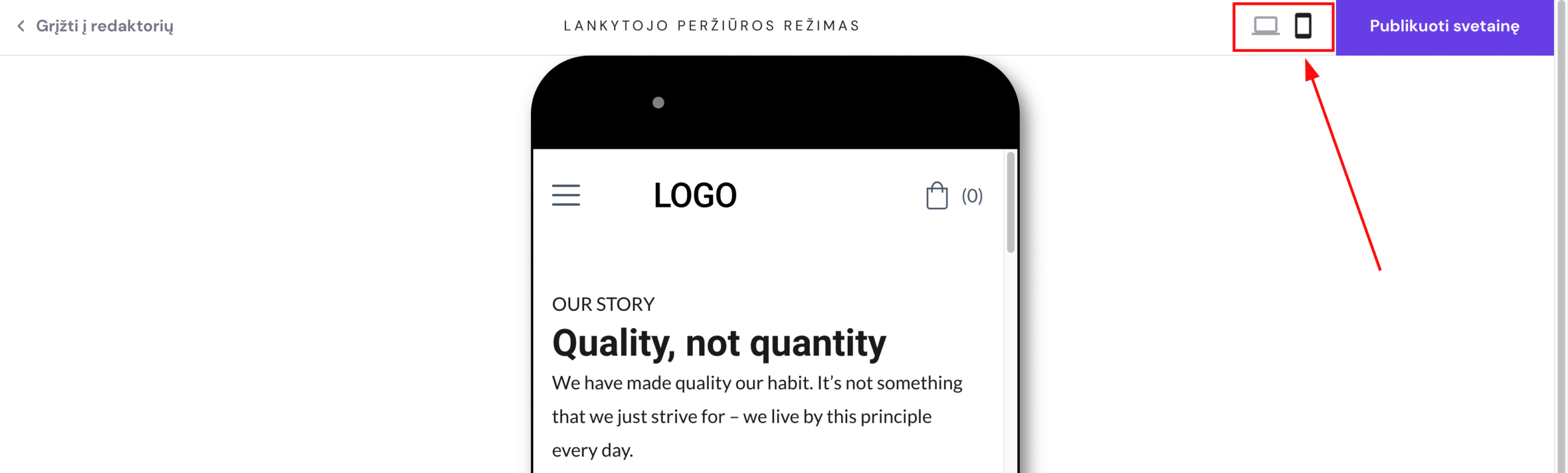 Norėdami peržiūrėti mobiliąją svetainės versiją, spauskite ant mobiliojo telefono ikonos viršutinėje įrankių juostoje: