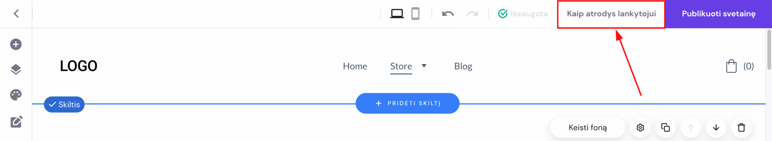 Svetainės redagavimo aplinkoje spauskite viršuje dešinėje esantį mygtuką Kaip atrodys lankytojui: