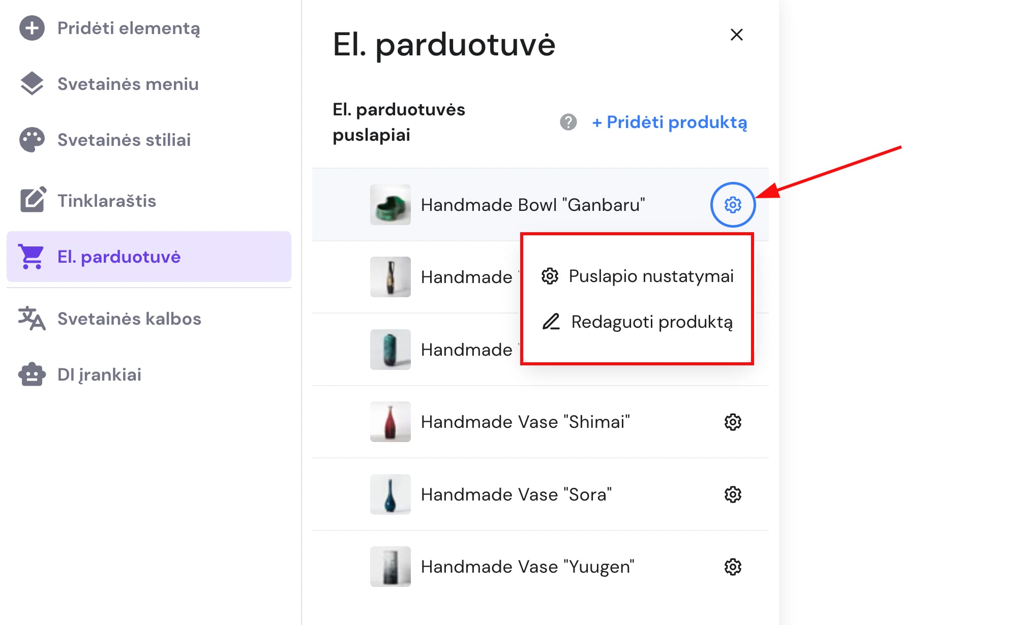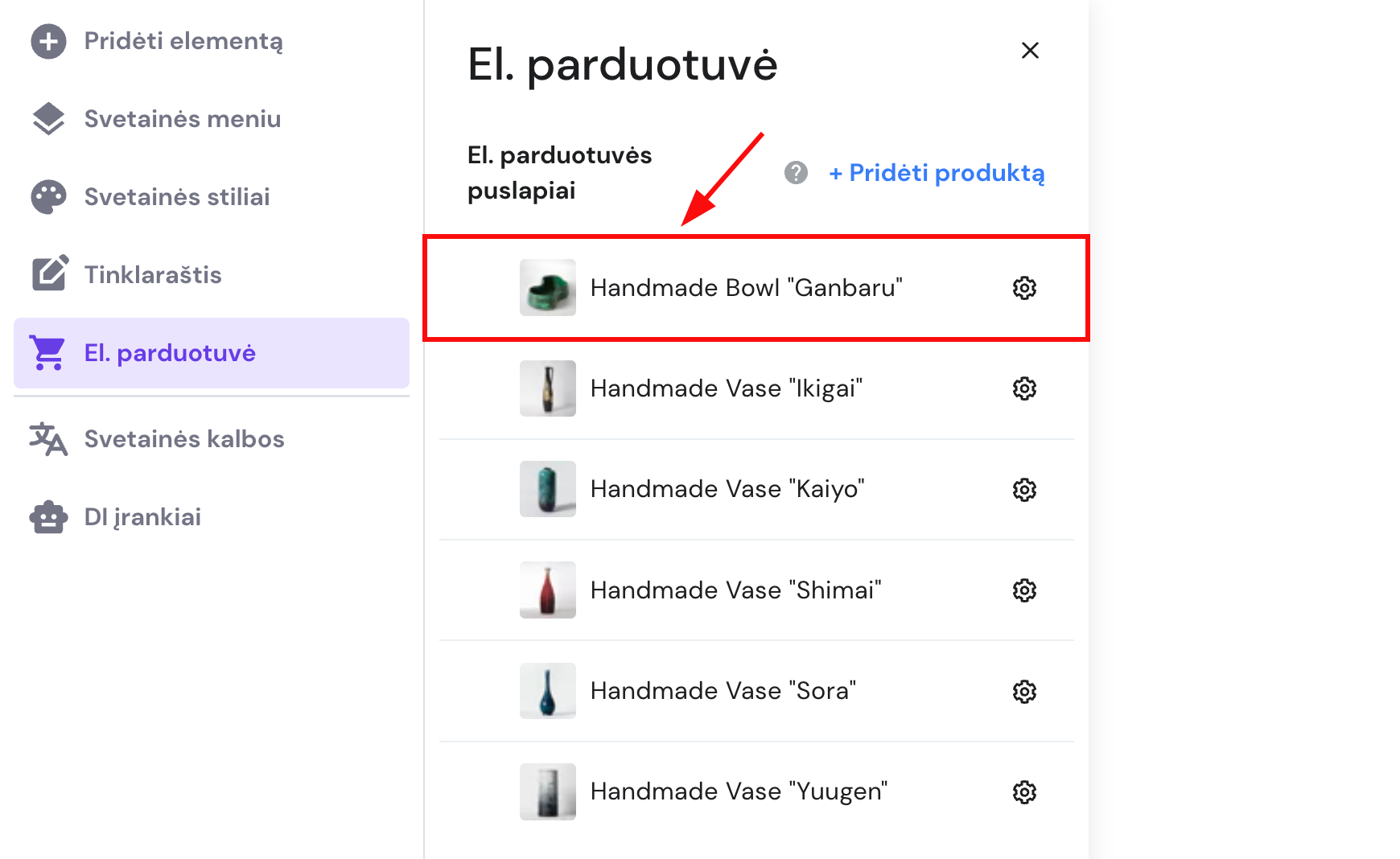 Išskleiskite kairėje esančią įrankių skiltį El. parduotuvė ir spauskite ant nustatymų ratuko šalia produkto pavadinimo: