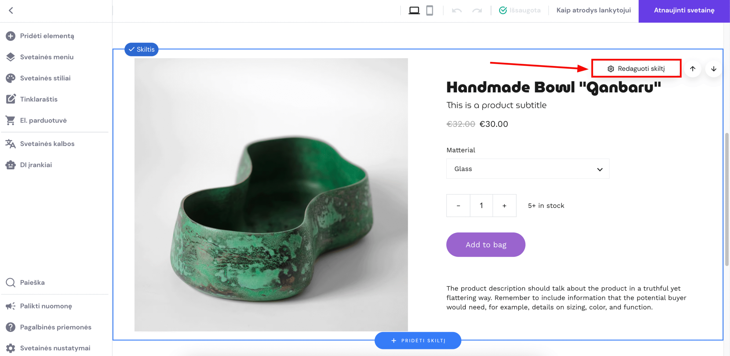 Visus produktų puslapius galite redaguoti individualiai: įterpkite juose papildomų svetainės skilčių ir pridėkite jose norimų elementų.