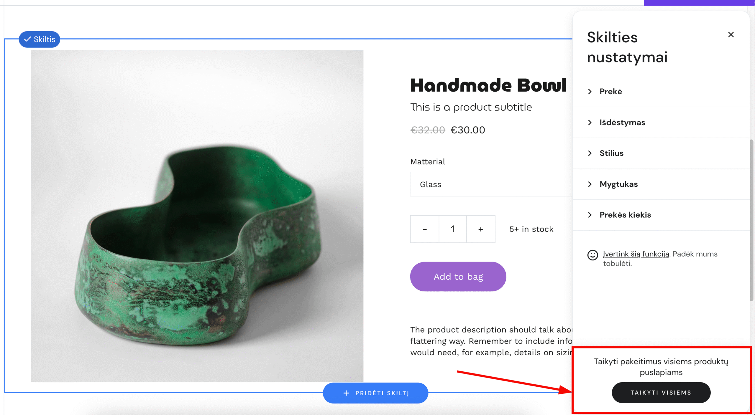 Atlikę pakeitimų, galite juos automatiškai pritaikyti ir kitiems produktų puslapiams – spauskite Taikyti visiems: