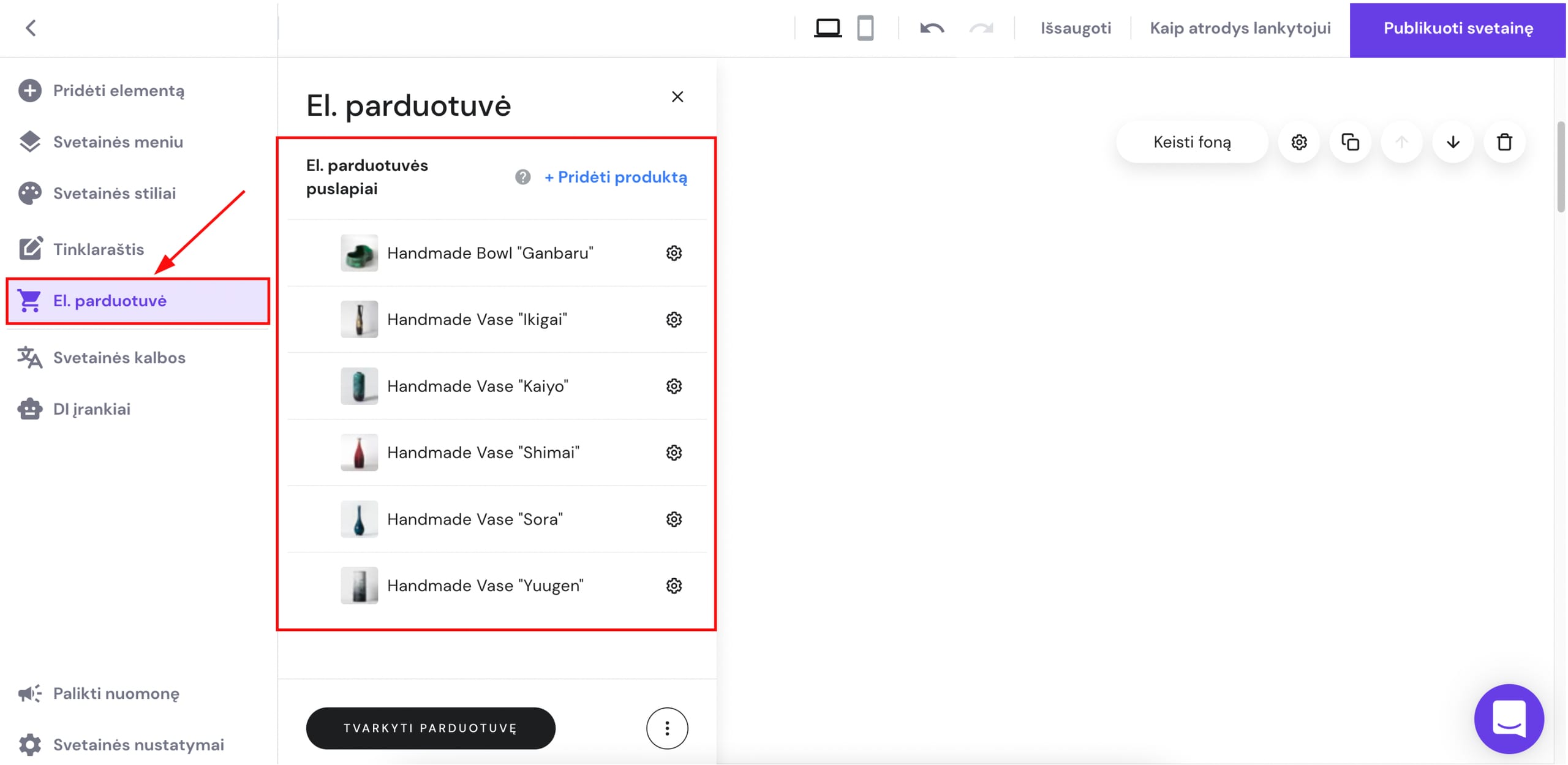 Visus produktų puslapius pasieksite svetainės redagavimo aplinkoje išskleidę kairėje esančią skiltį El. parduotuvė: