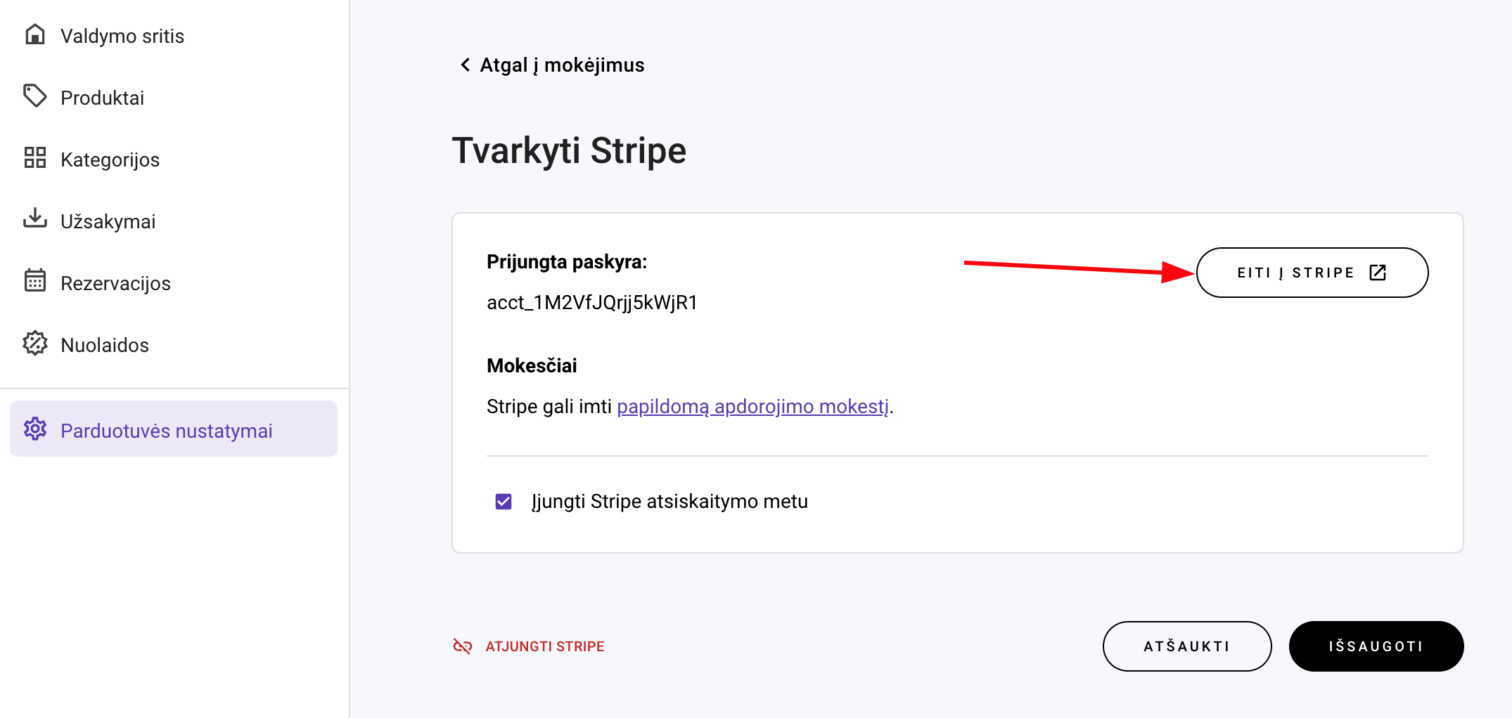 Stripe paskyrą taip pat galite pasiekti adresu dashboard.stripe.com bei savo el. parduotuvės valdymo zonos skiltyje Parduotuvės nustatymai → Mokėjimai → Tvarkyti (Stripe) → Eiti į Stripe: