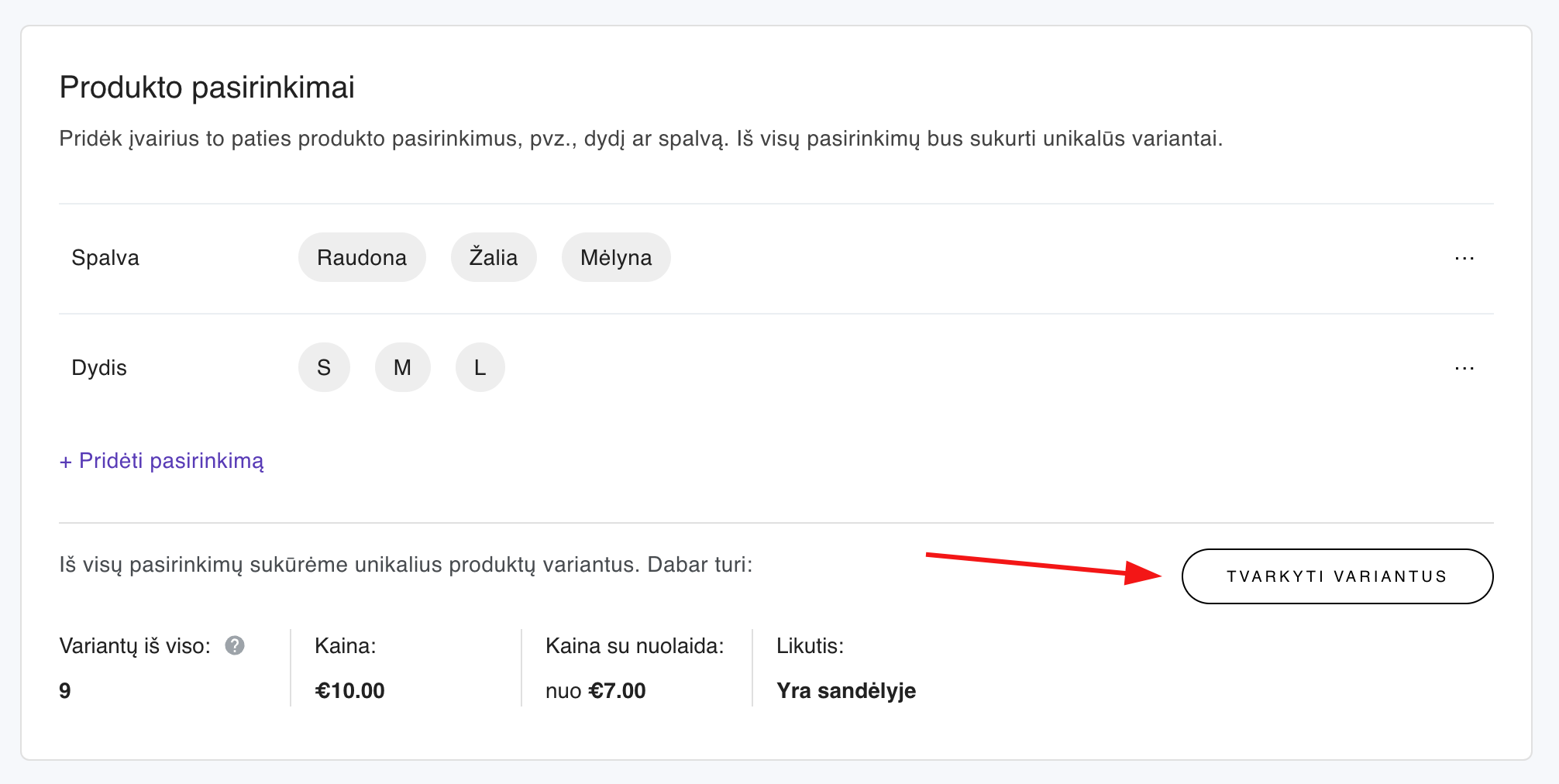 3. Produkto nustatymų skiltyje Produkto pasirinkimai spauskite Tvarkyti variantus: