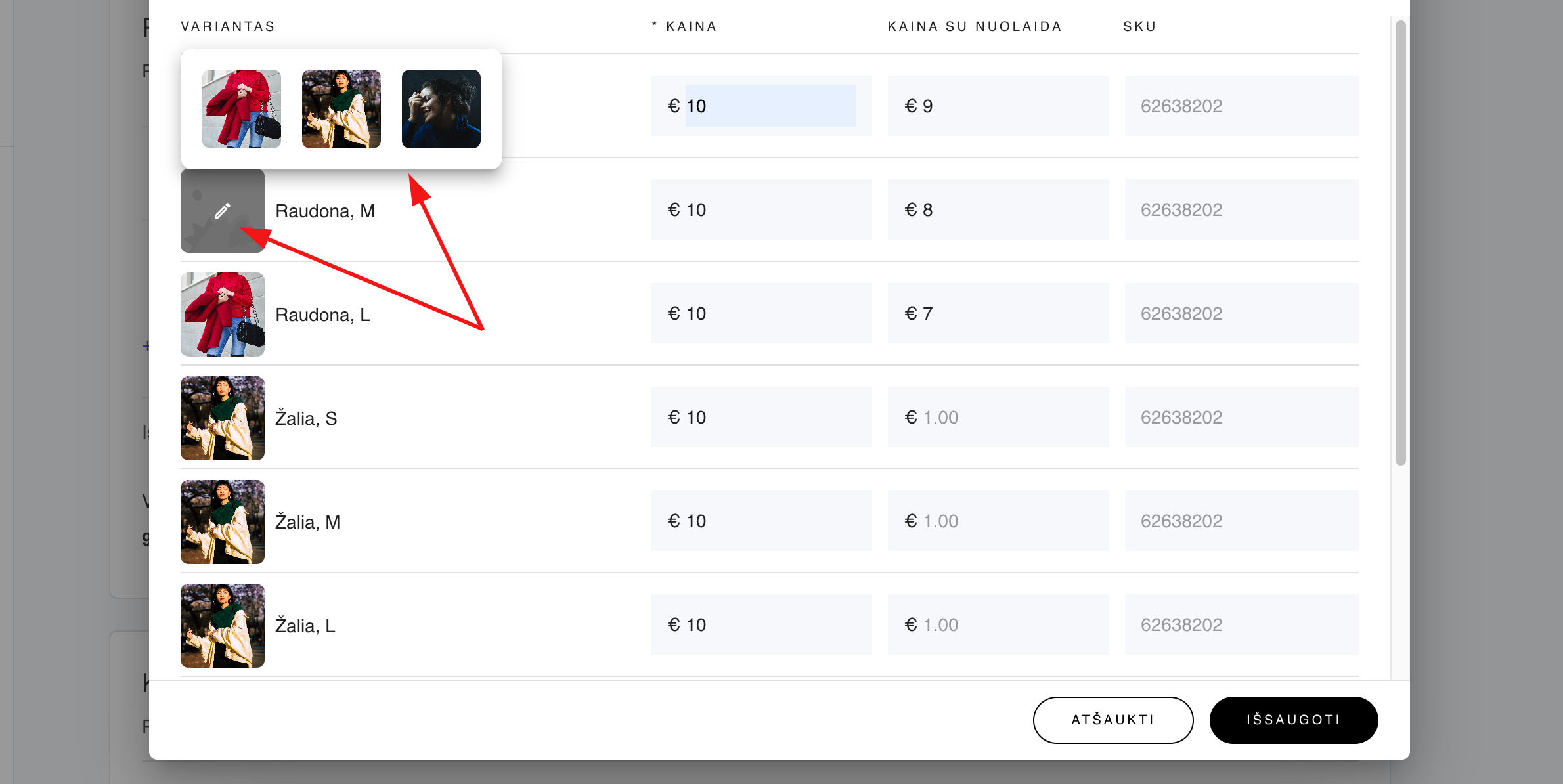 4. Prie pasirinkto produkto varianto spauskite ant paveikslėlio ikonos ir priskirkite norimą nuotrauką: