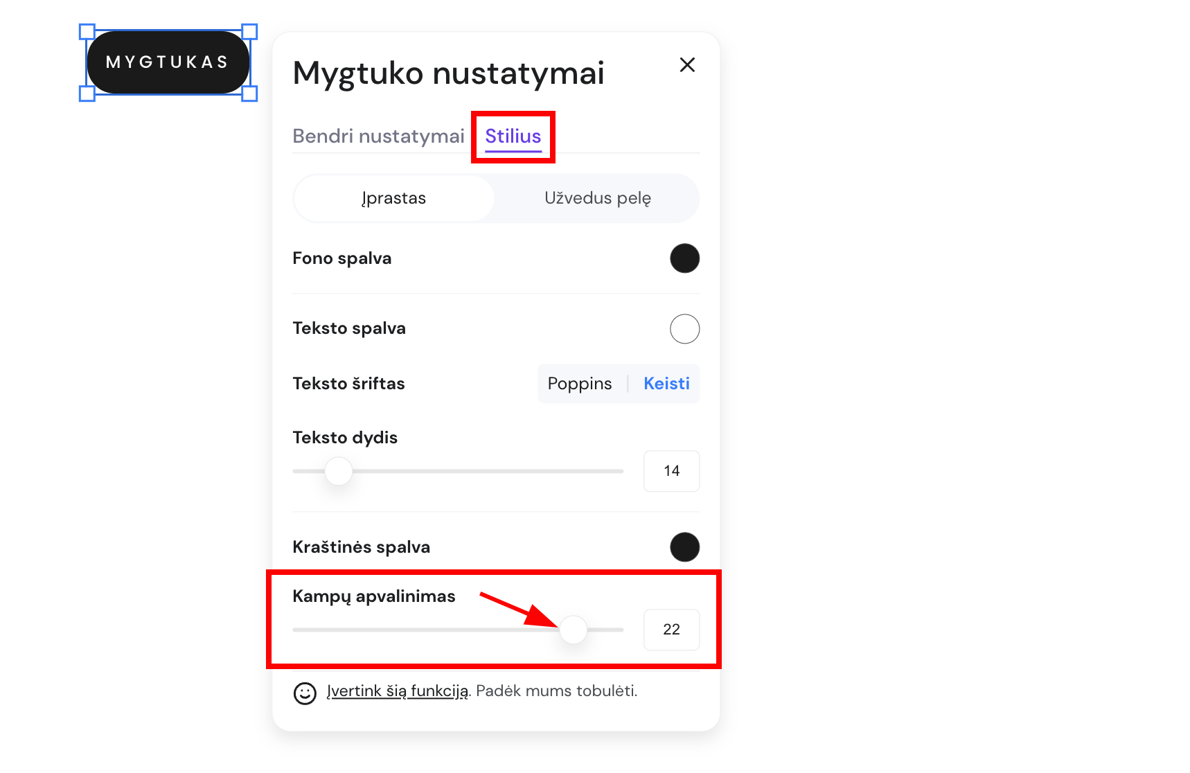Svetainės redagavimo aplinkoje spauskite ant norimo mygtuko elemento ir pasirinkite Redaguoti mygtuką. Nustatymų skiltyje Stilius keiskite kraštinių apvalinimą: