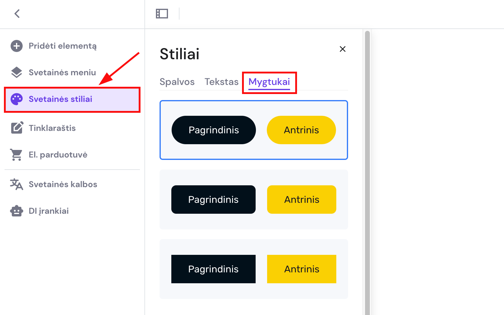 Svetainės redagavimo aplinkoje išskleiskite kairėje esančią skiltį Svetainės stiliai ir poskiltyje Mygtukai pasirinkite norimą mygtukų formą: