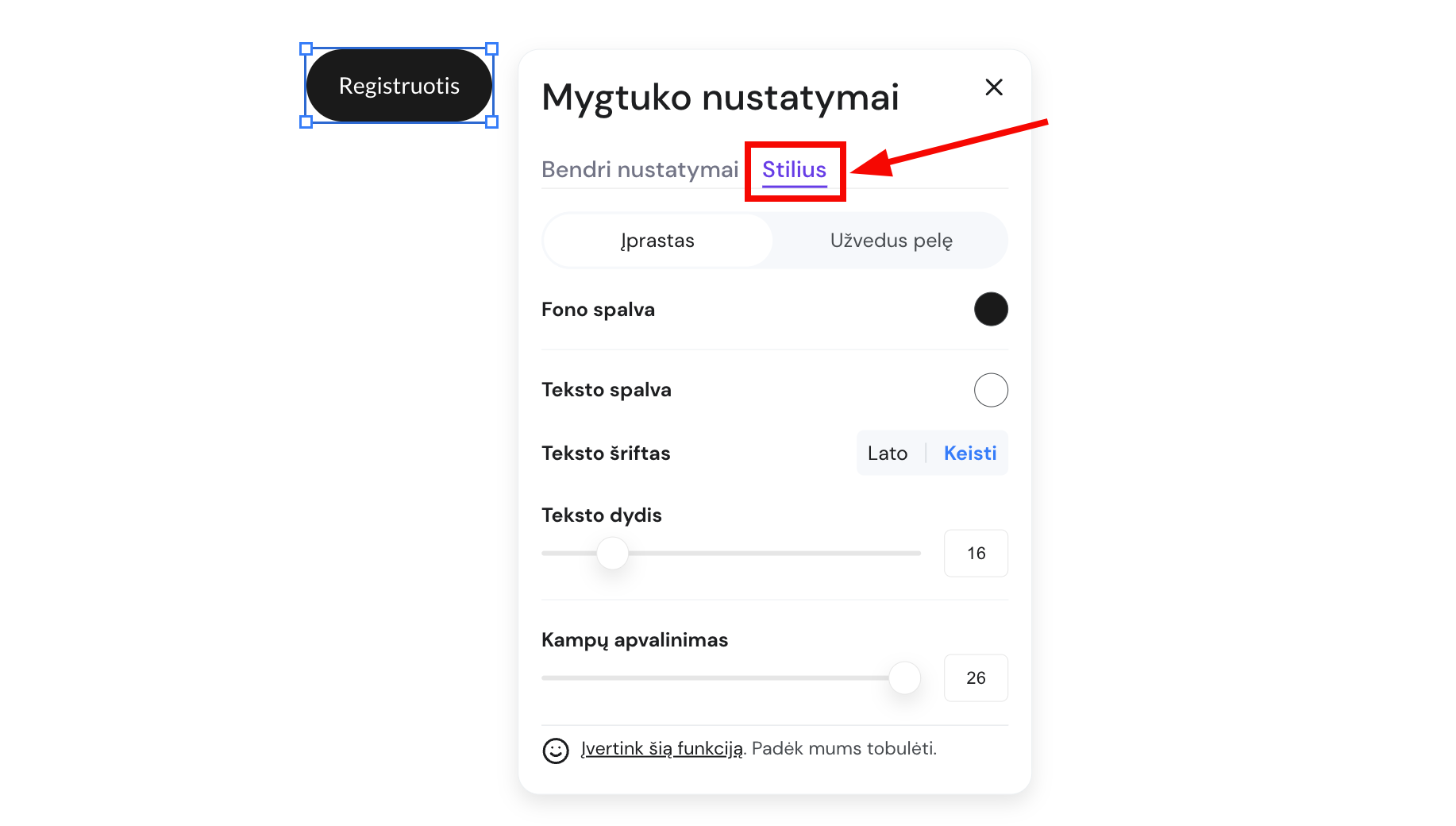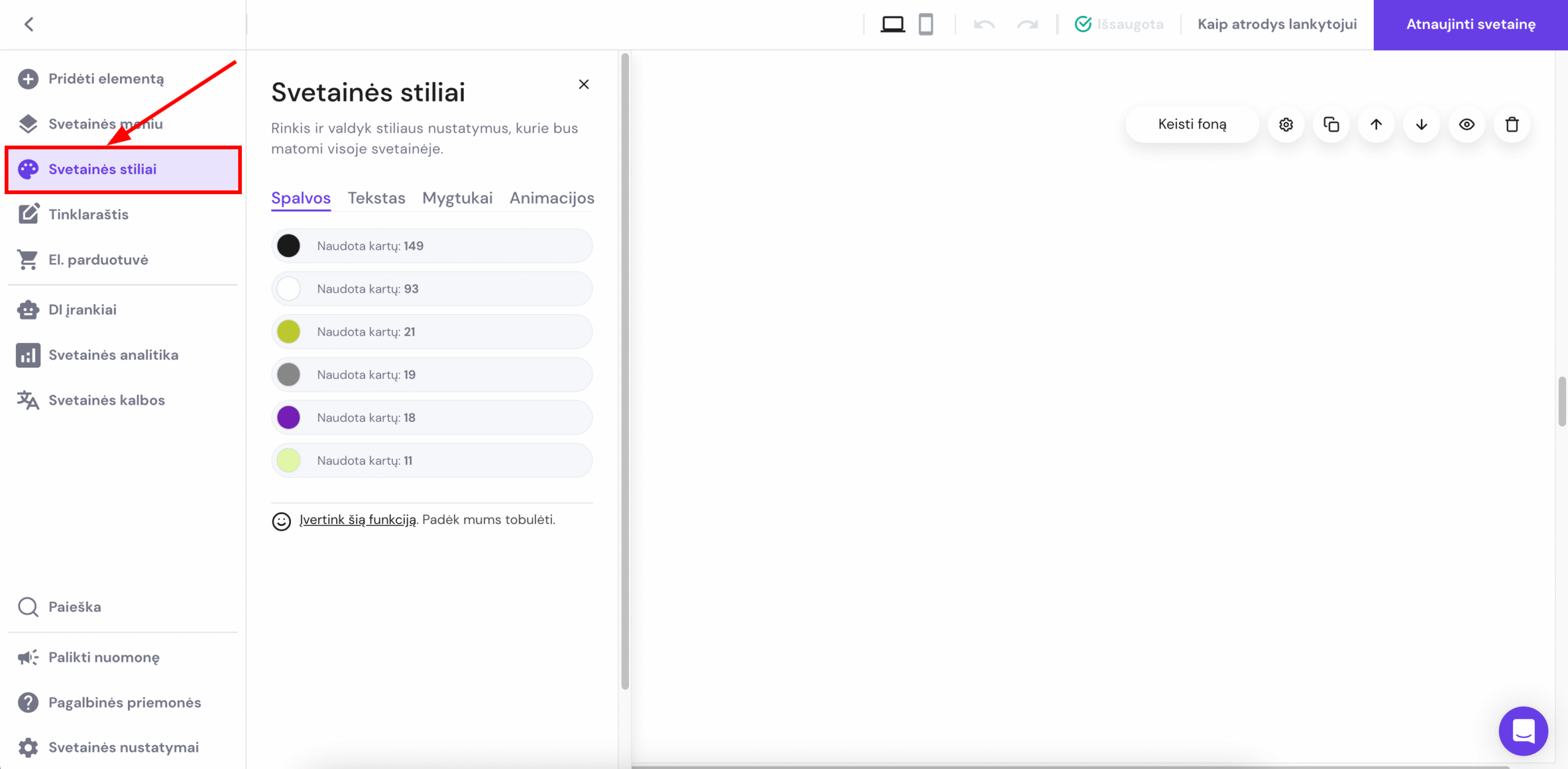 Svetainės redagavimo aplinkoje išskleiskite kairėje esančią skiltį Svetainės stiliai: