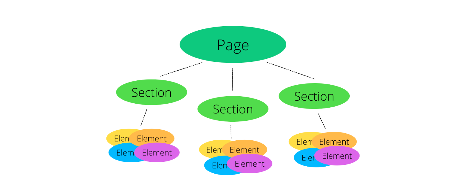 Iš esmės, svetainę sudaro puslapiai (angl. page), kuriuos sudaro skiltys (angl. section), kuriose yra tam tikrų elementų (angl. element):