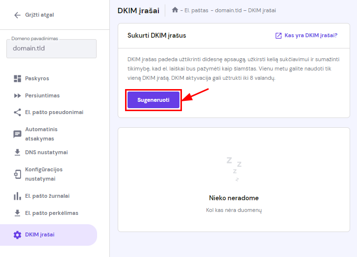 Norėdami sukurti savo el. paštui šį įrašą, eikite į El. paštas sekciją, pasirinkite savo domeną ir kairėje pusėje esančiame meniu pasirinkite DKIM įrašai. Tuomet, spauskite Sugeneruoti: