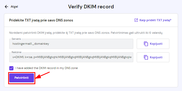 Kai propagacija pasibaigs, galėsite įsitikinti, kad įrašai buvo pridėti teisingai, atidarydami DKIM įrašai sekciją, pažymėdami varnelę ir spausdami Patvirtinti: