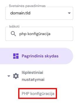 hPanel valdymo skyde eikite į Svetainės → Valdyti, kairėje pusėje esančioje paieškoje raskite PHP konfigūracija ir paspauskite: