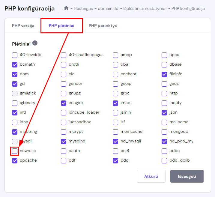 Atidarykite skirtuką PHP plėtiniai. Apačioje radę newrelic, pažymėkite varnele, kad jį įjungtumėte: