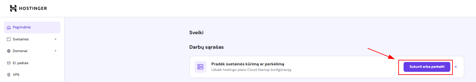 Naujai įsigyto hostingo plano aktyvavimas Hostinger paskyros valdymo skydelyje