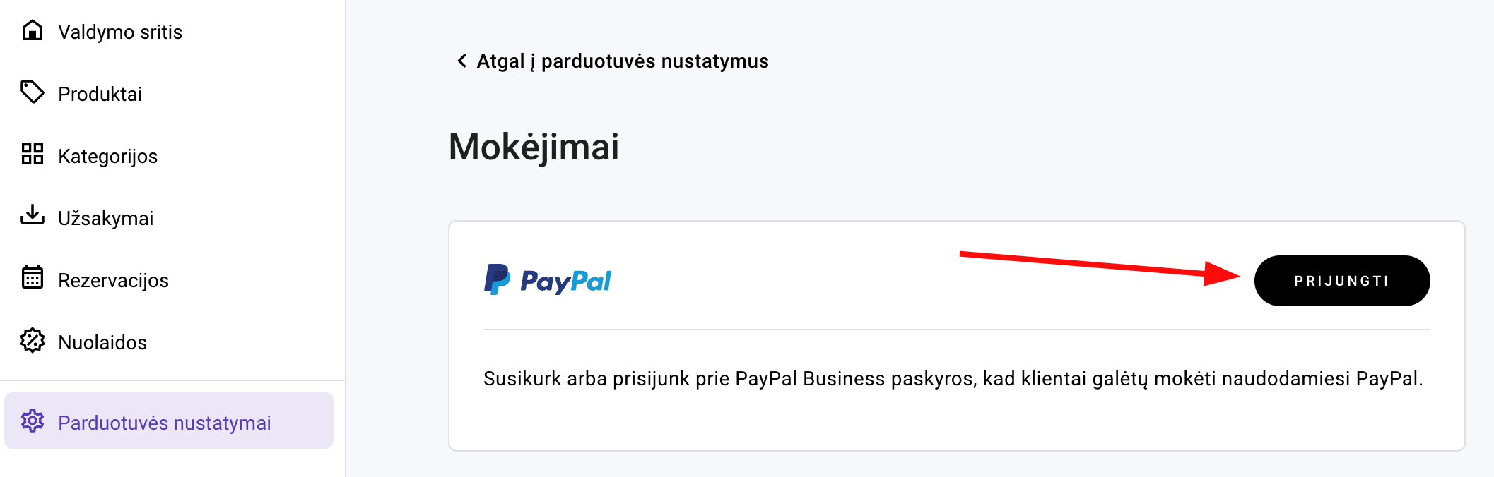 Norėdami įgalinti PayPal mokėjimus, atsidarykite parduotuvės valdymo zonos skiltį Parduotuvės nustatymai Mokėjimai ir šalia PayPal spauskite Prijungti: