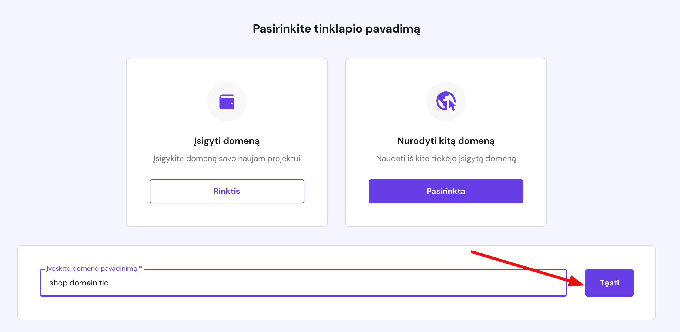 3. Pasirinkite Nurodyti kitą domeną, įveskite savo subdomeną ir spauskite Tęsti: