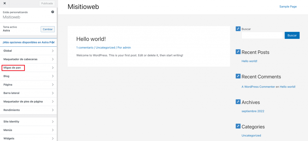 Utilizando temas con funciones de migas de pan incorporadas, como Astra y OceanWP.