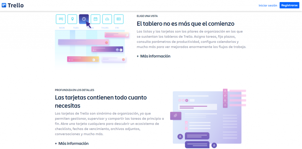 En muchos casos, este formato simplemente alterna la colocación de texto e imágenes en un patrón de zig-zag, como en este ejemplo del sitio de Trello: