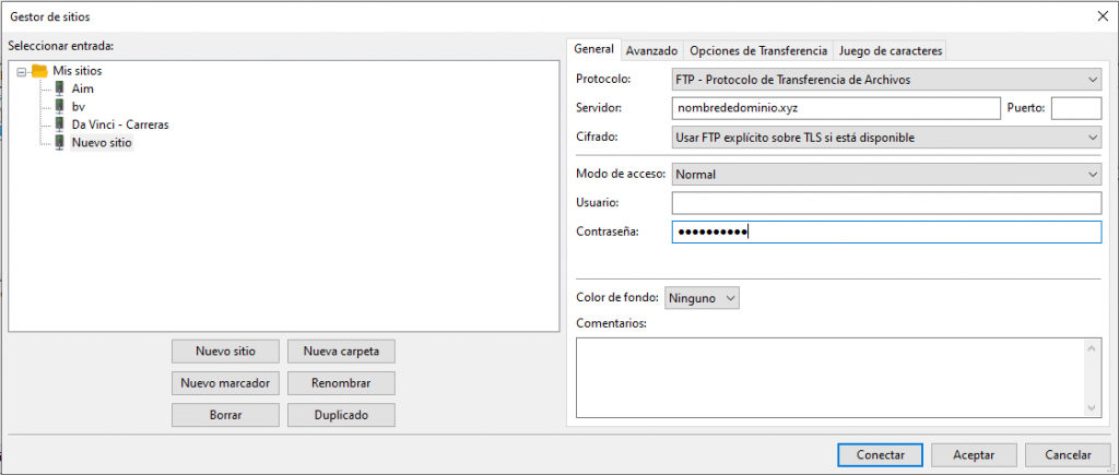 4. Selecciona Nuevo sitio en la ventana emergente para realizar una nueva conexión. Rellena los campos con la información que has recogido en el segundo paso. Deja los ajustes como están y pulsa Conectar.