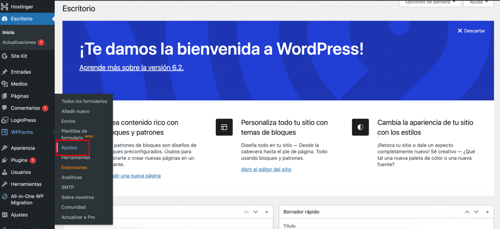 Antes de personalizar tu página de inicio, debes activar la extensión necesaria. Para ello abre el panel de administración de WP y sigue estos pasos: