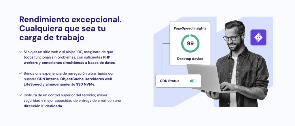 El texto es conciso y fácil de entender. También destaca los principales beneficios del servicio de hosting con textos como “alto rendimiento” y “potente panel de control”, mientras elabora brevemente sobre los puntos utilizando un lenguaje persuasivo.