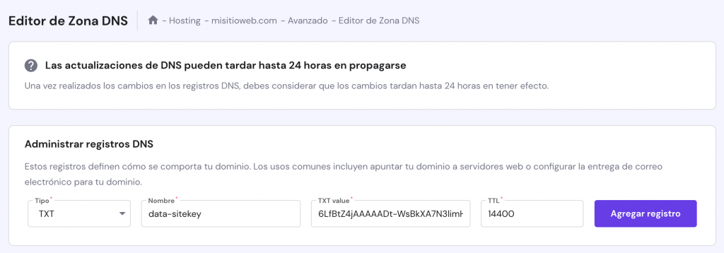 A continuación, añade la clave secreta a los registros DNS. Si utilizas Hostinger como proveedor de alojamiento web, dirígete al Editor de zona DNS en el hPanel de tu dominio. En Gestionar registros DNS, añade data-sitekey en Nombre y tu clave secreta en Valor TXT. Haz clic en el botón Añadir registro.