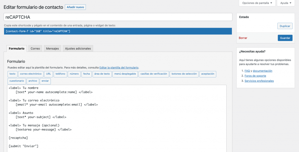 Una vez que edites el contenido del campo del formulario, añade “[recaptcha]” antes de la línea “[submit “Enviar”]”. Haz clic en el botón Guardar. Aparecerá un shortcode generado debajo del título.
