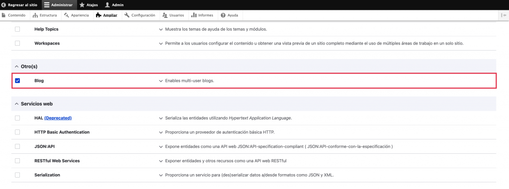 Una vez instalado, el módulo Blog aparecerá en el menú Ampliar. Marca la casilla junto a Blog y haz clic en Instalar para activar el módulo.
