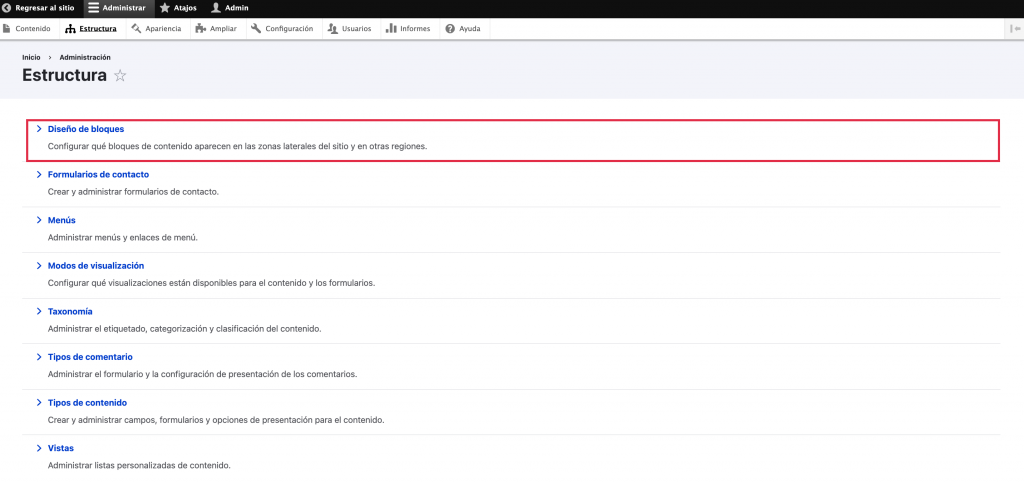 Esta funcionalidad, proporcionada por el módulo central Block, forma parte del núcleo de Drupal 8. Utilízalo con los módulos Custom Block y Place Block para incorporar bloques en cualquier página.