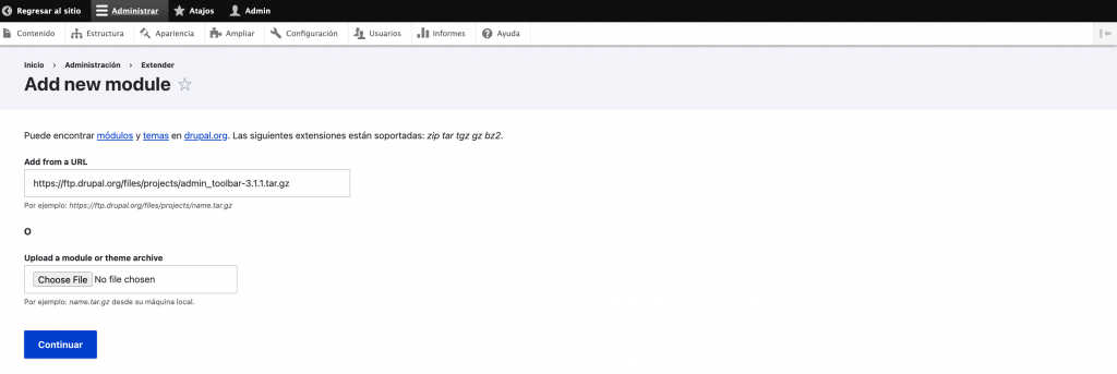 Sigue estas instrucciones para instalar un módulo utilizando la interfaz administrativa: