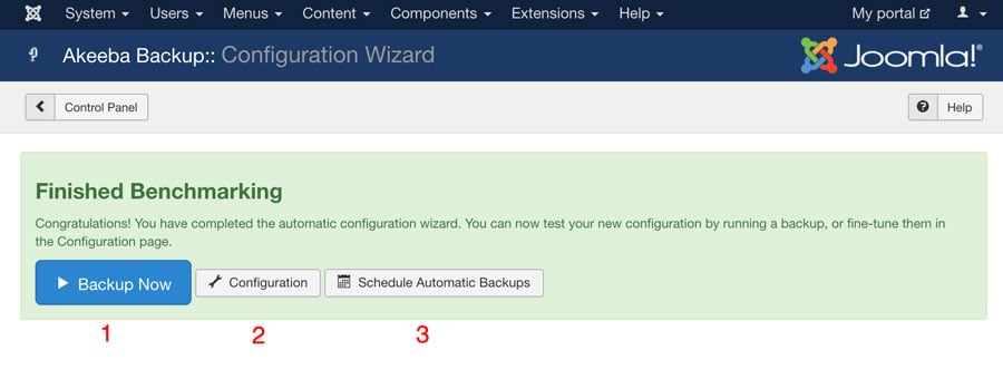 Al acceder al componente de Akeeba por primera vez, pasarás por el asistente automatizado de evaluación comparativa, que configurará tu componente para un rendimiento de copia de seguridad óptimo. Cuando termine, recibirá un mensaje de confirmación.