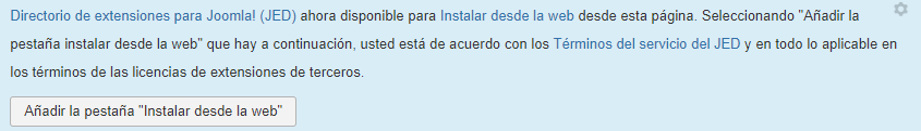 Las extensiones se pueden instalar y administrar en Extensiones -> Gestionar. Joomla! te preguntará si deseas habilitar la pestaña Instalar desde la Web. Recomendamos habilitar esta pestaña ya que le permitirá buscar e instalar extensiones de Joomla! sin la necesidad de salir del panel de administrador de Joomla!.