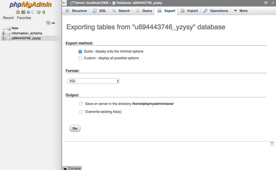 Una vez dentro de phpMyAdmin, da clic en la pestaña Exportar (Export) y luego presione el botón Ir (Go) para descargar el archivo .sql.