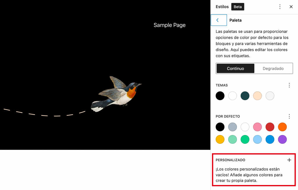 Al abrir el panel de estilos globales, verás que la paleta de colores por defecto del tema ha cambiado según el código CSS.